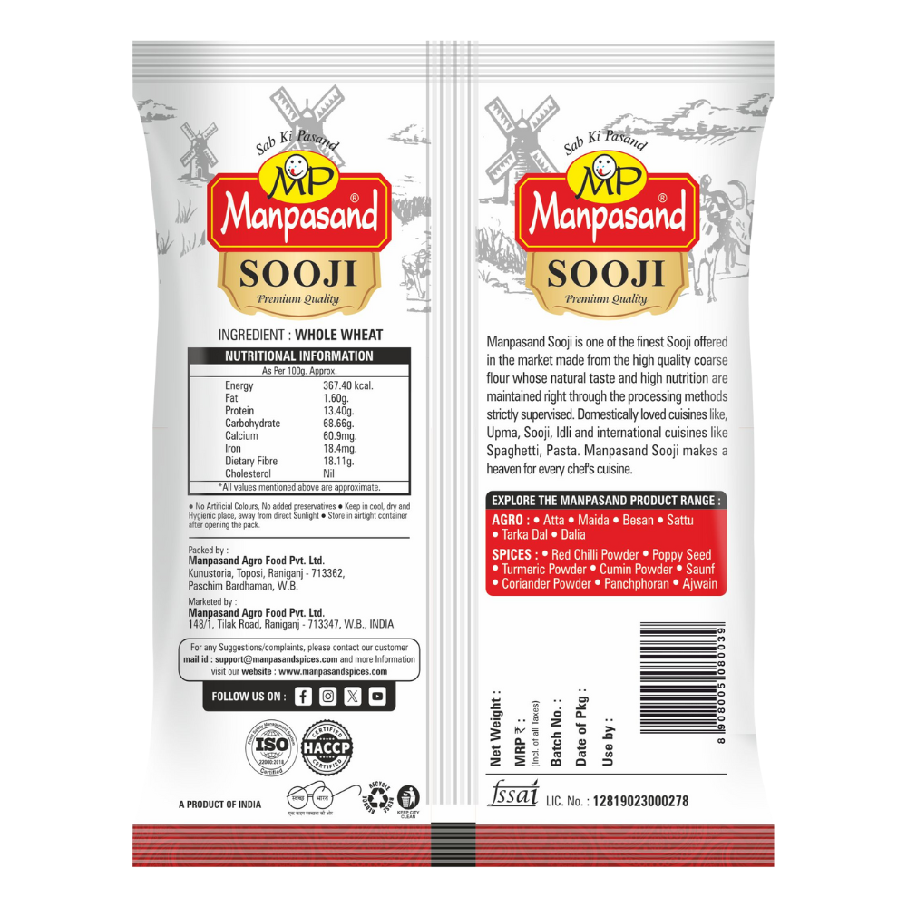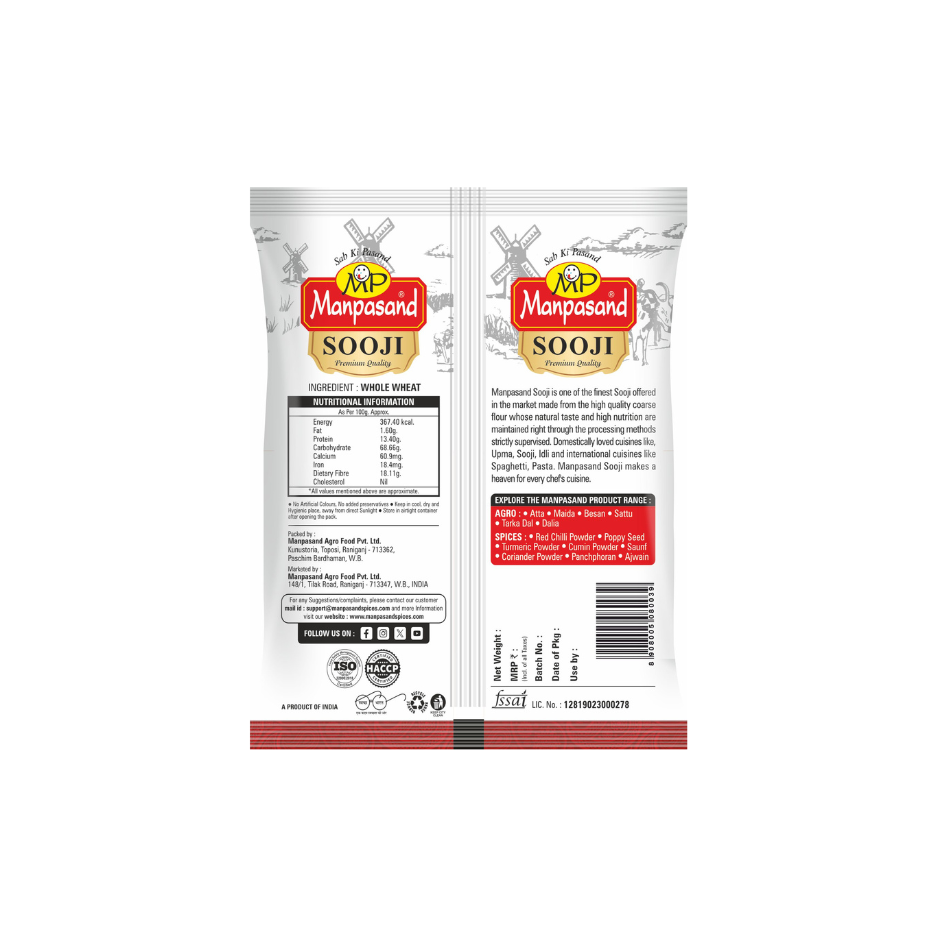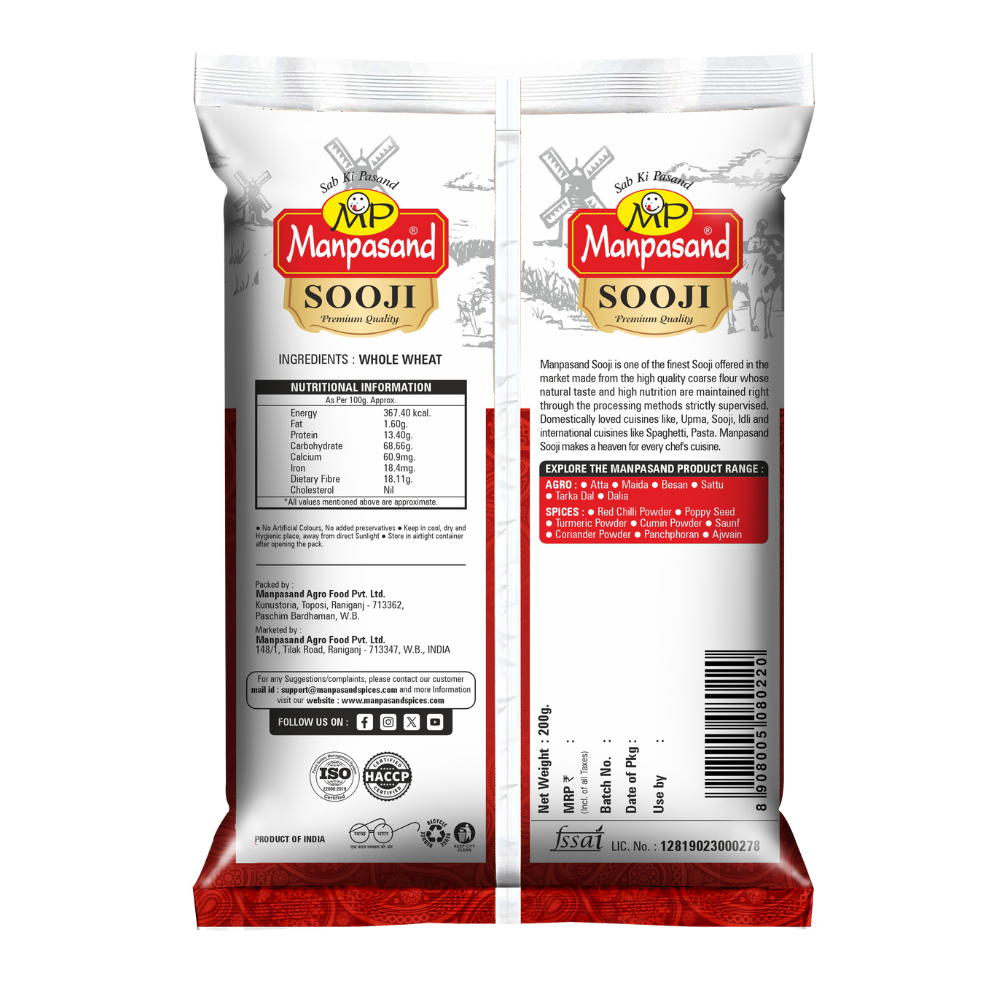 Coarse and finely milled for perfect texture, Manpasand Sooji is ideal for making soft upma, crispy snacks, and delicious halwa. Rich in energy and essential nutrients.